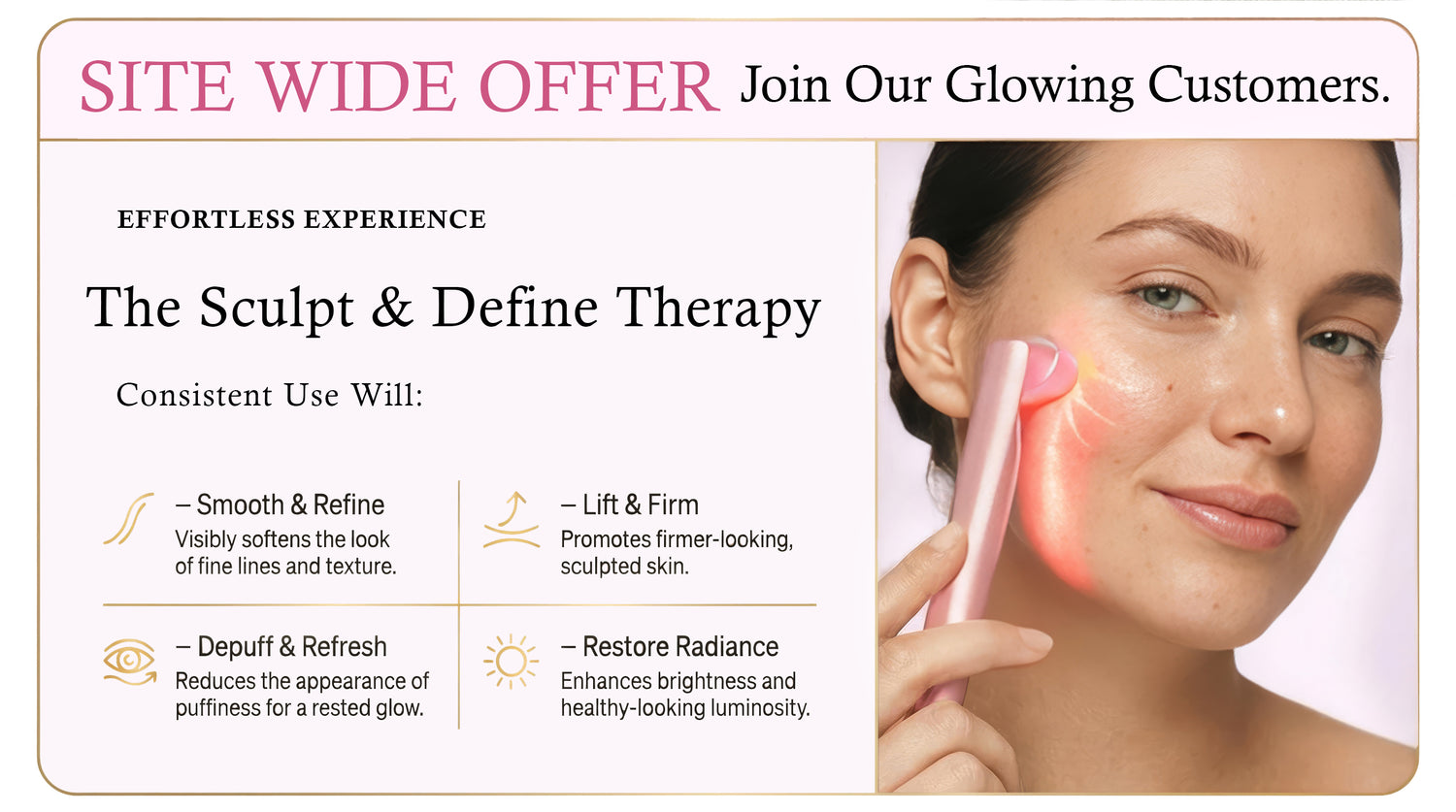 Reveal smoother, firmer, radiant skin in minutes a day with the LumaTique Radiance Pro™ — a luxury 4-in-1 facial wand that blends red light therapy, gentle microcurrent, soothing warmth, and sculpting massage to visibly refresh and rejuvenate your complexion from home.
